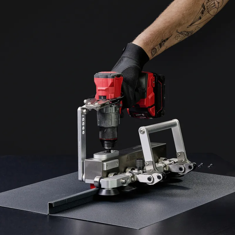 Pierwsze bezprzewodowe, lekkie, składane narzędzie zasilane wiertarką, które umożliwia dekarzom podwójne ryglowanie dachów w jednym kroku.